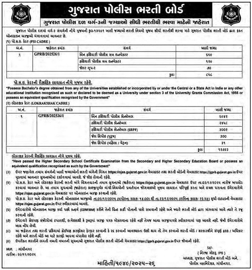 Gujarat Police Recruitment 2025: 13591 PSI & Constable Vacancies